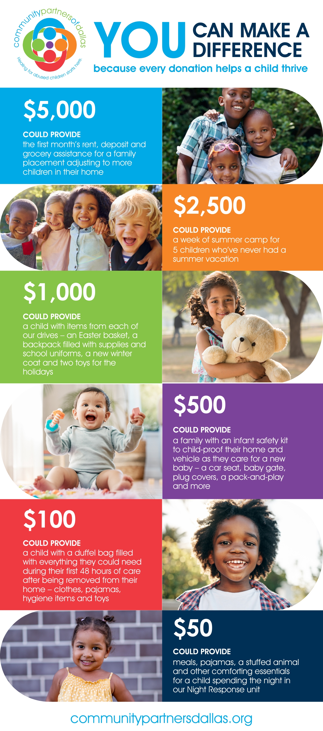 Community Partners of Dallas provides what abused children urgently need today to thrive tomorrow. Click here to learn more.